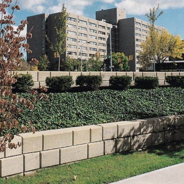 Dura-Hold II is similar to Dura-Hold in appearance, but is just over half the size, making it economical in terms of material cost, speed and efficiency for lower retaining walls. Its large scale (standard size weighs 940lbs) is disguised by false joints which cast bold shadows to give the appearance of several individual blocks in each unit. Build gravity walls up to 4ft (1.2m) or grid reinforced walls up to 25ft (7.6m) high with proper engineering under typical conditions. Concrete tie-backs or geogrid give this wall various engineering options. Coping units are also available.